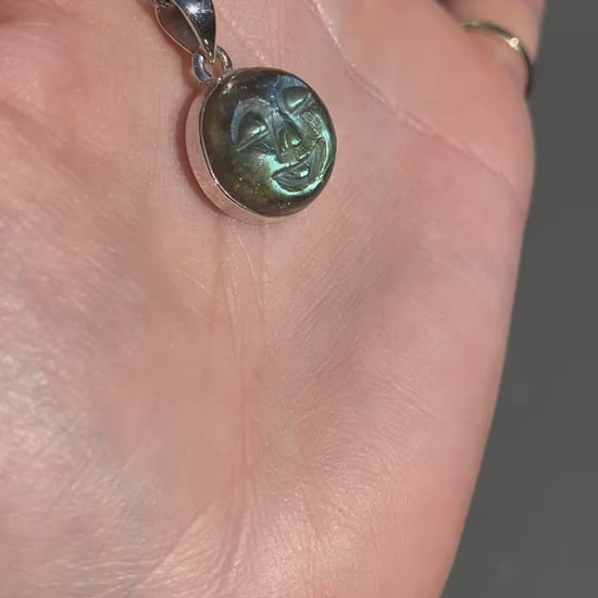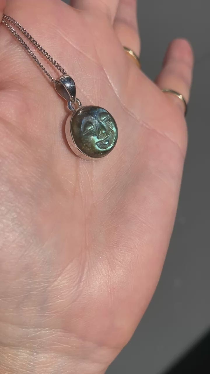 Carved goddess face blur fire labradorite 15mm round Sterling silver