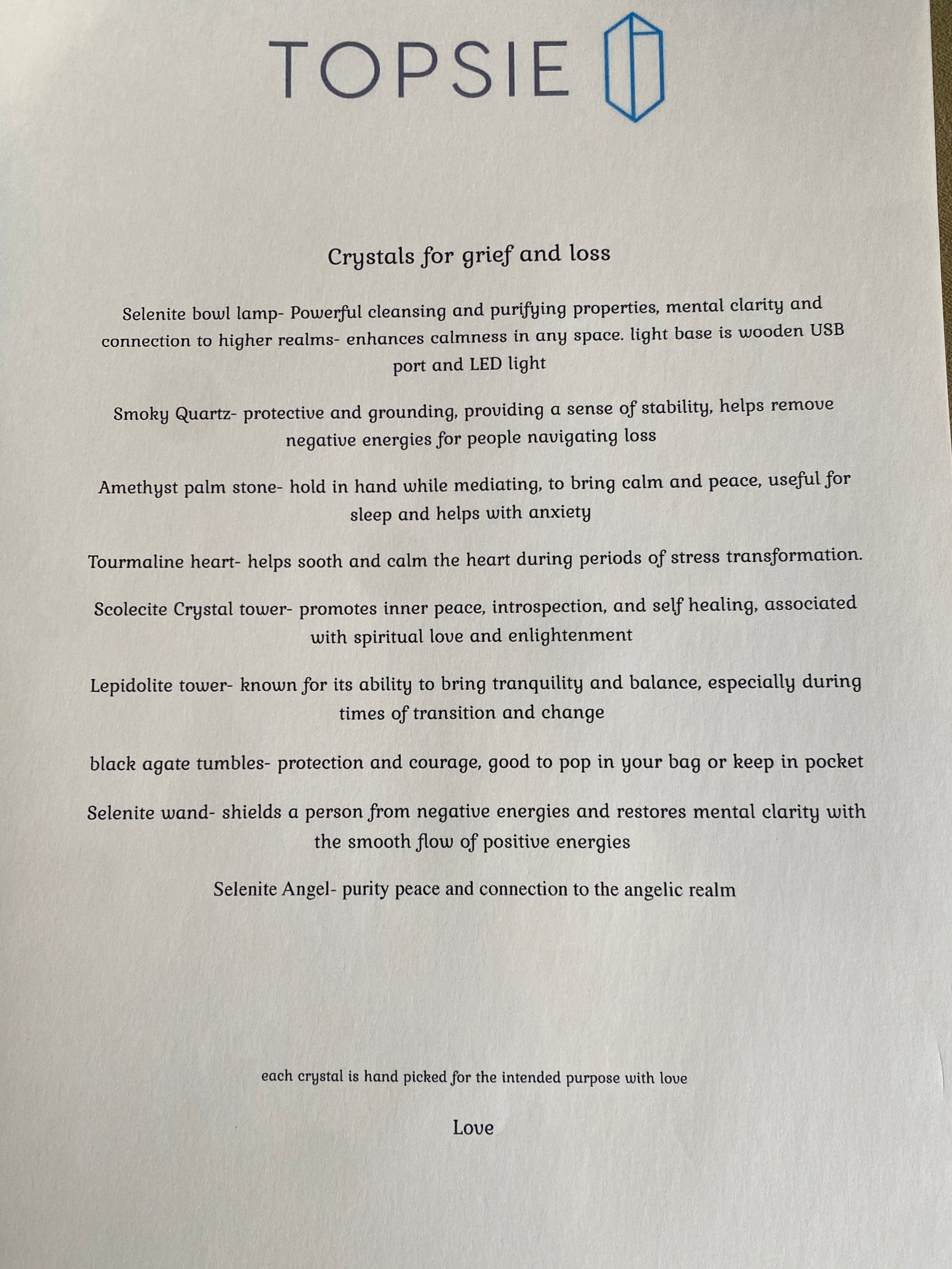 Smoky Quartz- protective and grounding, providing a sense of stability, helps remove negative energies for people navigating loss