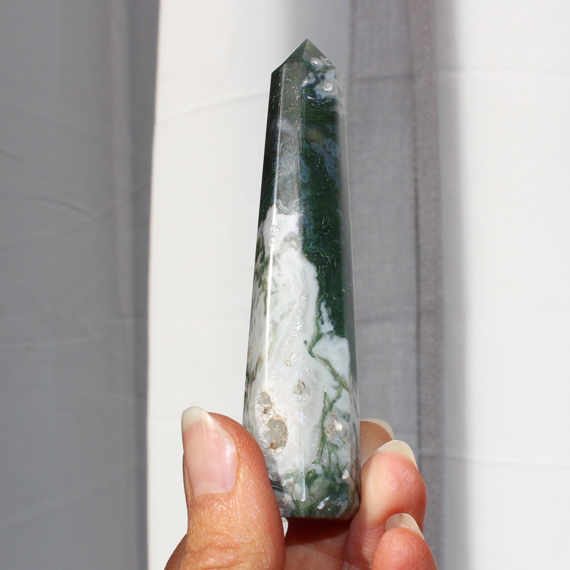Moss agate tower 66grams 10cm