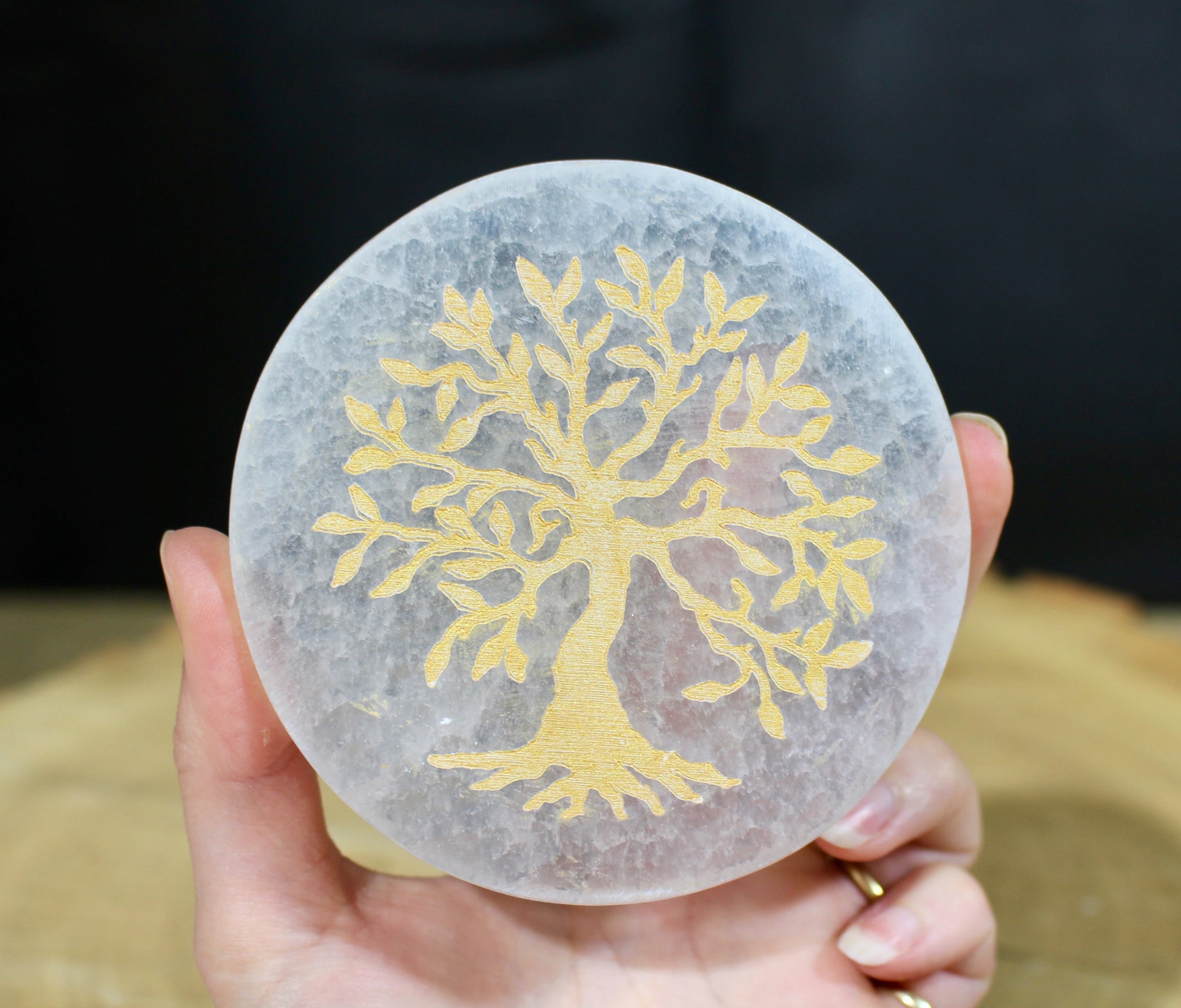 hand carved gold tree on selenite charging plate